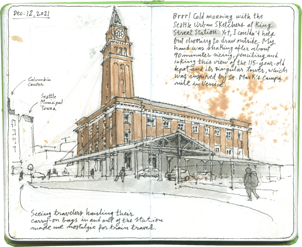 Dec. 12, 2021. Brrrrr! Cold morning with @uskseattle at King Street Station. Yet I couldn’t help but choosing to draw outside, which I haven’t done