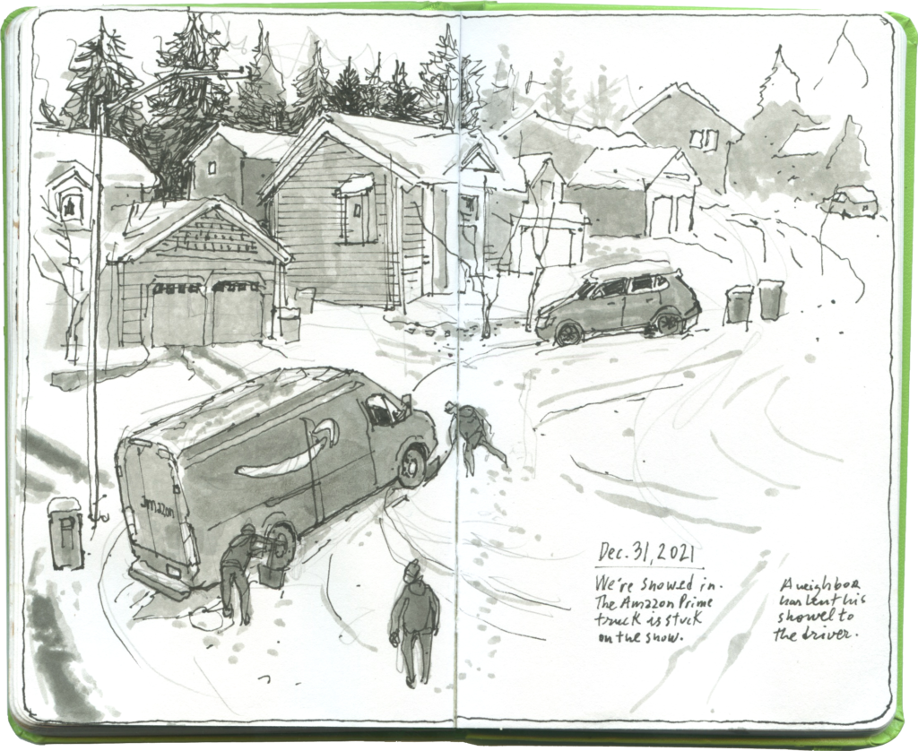 On New Year’s Eve, I went out for a walk hoping to make a sketch that would lift up my dwindling creative spirits. The scene