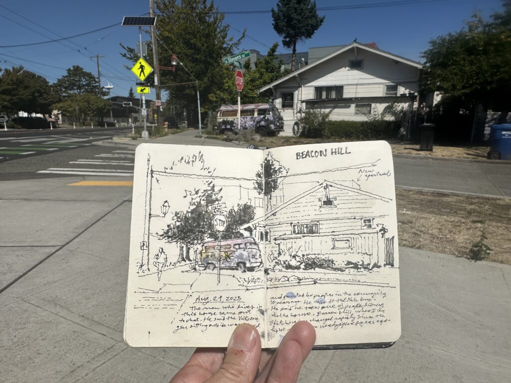 Eventful sketchwalk with @uskseattle in Beacon Hill this morning. An old Volkswagen van painted with a colorful graffiti of flowers and a night skyline caught my eye. Half way through my sketch a man with the biggest smile walked over and said: “Let me move it around so you can see the other side!” That led to the next sketch and a wonderful conversation.
