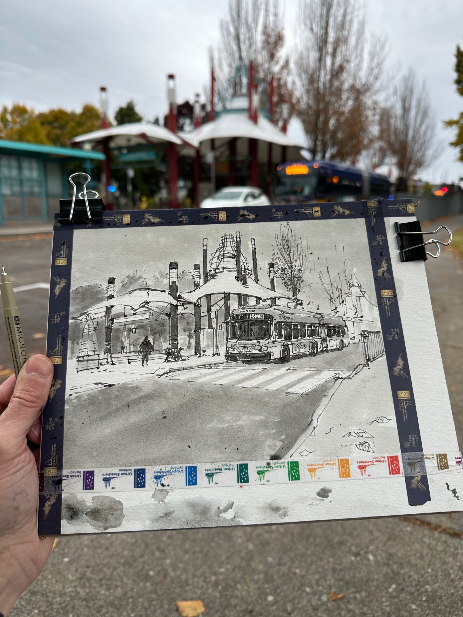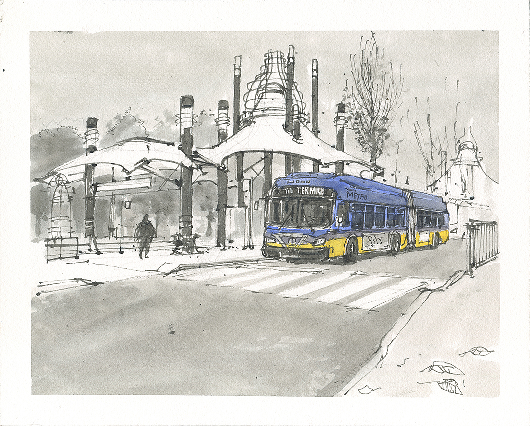Today, the once-bustling shelter stands rather lonesome. Passenger service has shifted to the bus loop next to the new light rail station. Buses still roll through for layovers, but no-one hops on and off anymore. If you ever boarded one of those blue or green streak buses here, you probably have this whimsical bus stop etched into your memory.