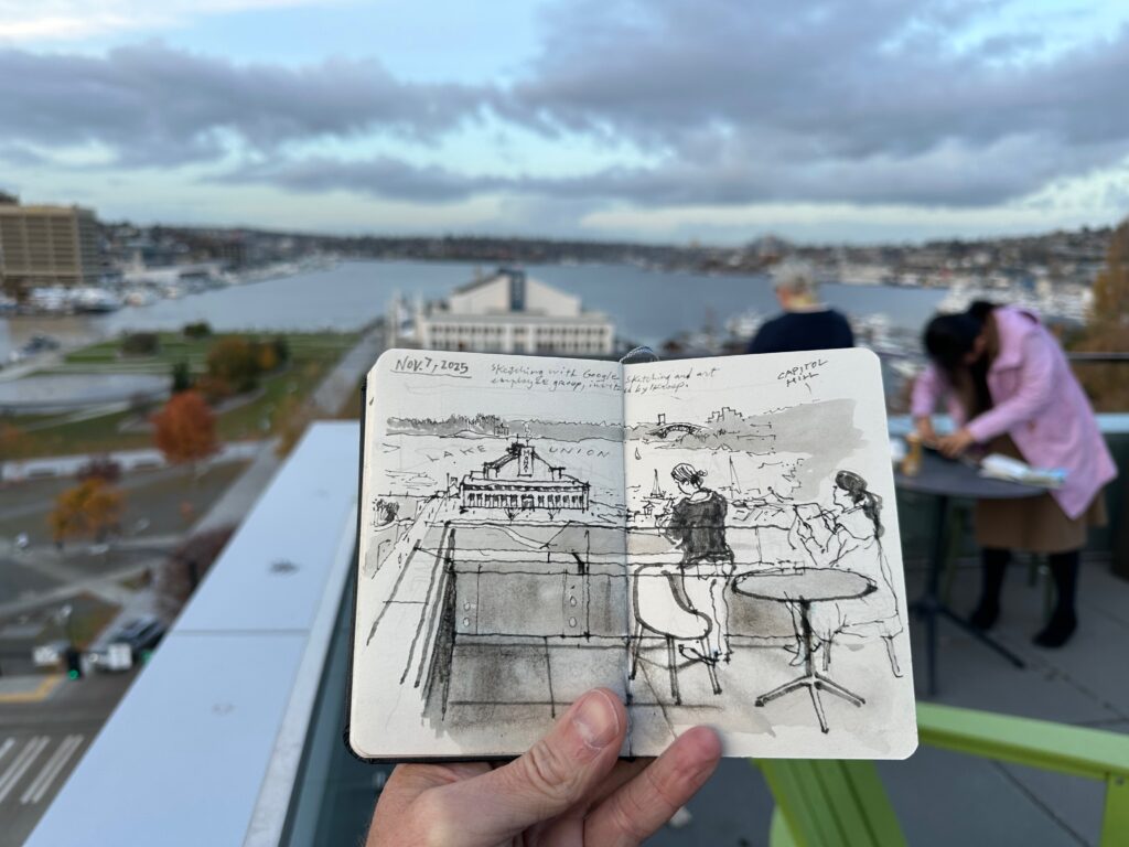 This afternoon I hopped on the light rail to go meet and sketch with the Seattle Google Employees Art group. Big thank you to fellow urban sketcher @inkroop for the invitation and the opportunity to talk about urban sketching and how the @urbansketchers movement started. I had a blast!